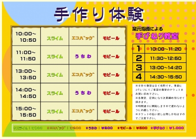 各種ワークショップ(手作り体験)開催時間は以下の通り。